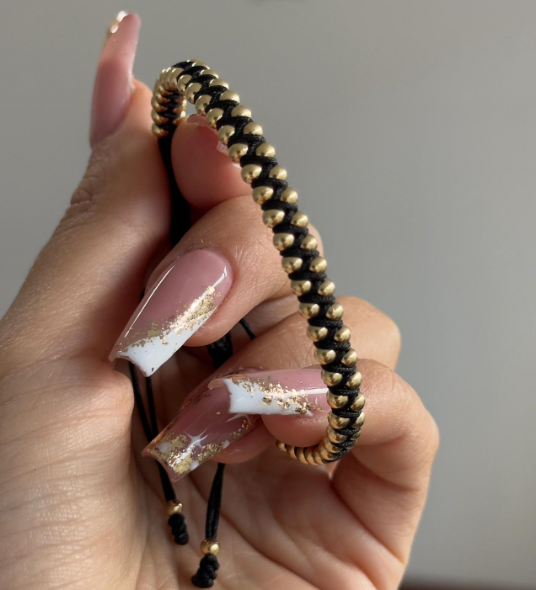 BLACK THREAD BRACELET WITH SQUARE HARDWARE, GREEN - WHITE ZIRCON + 4 BALLS, 4M, 18K YELLOW GOLD - 1.72GR