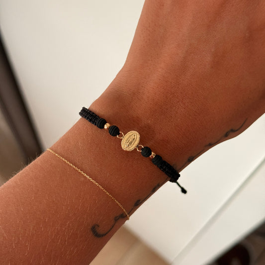 BLACK THREAD BRACELET VIRGIN OF GUADALUPE + 2 3M YELLOW GOLD 18K BALLS 0.5GR