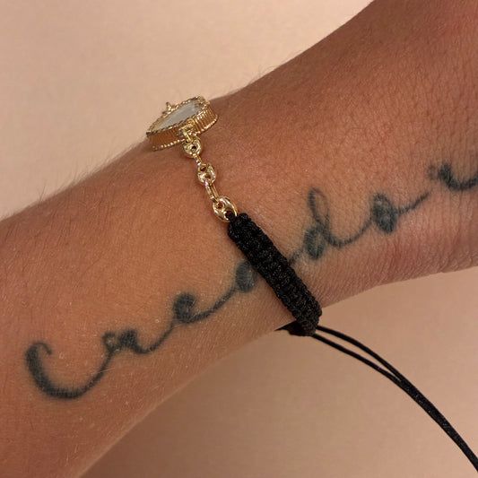 BLACK THREAD BRACELET WHITE HEART CHARM + COFFEE BEAN 18K YELLOW GOLD - 1.83GR