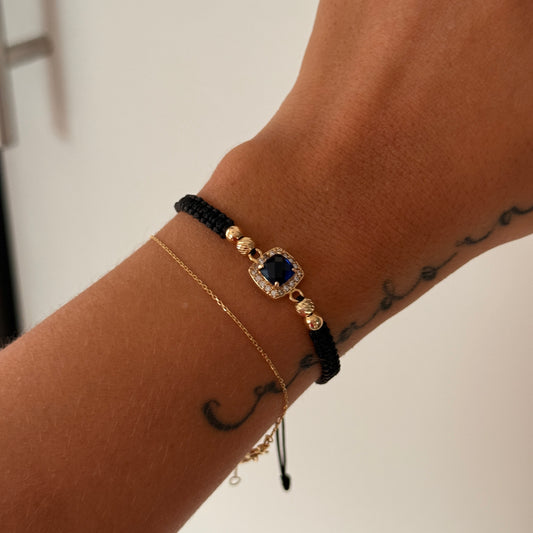 BLACK THREAD BRACELET WITH SQUARE BLUE - WHITE ZIRCON HARDWARE + 4 18K YELLOW GOLD 4M BALLS - 1.72GR