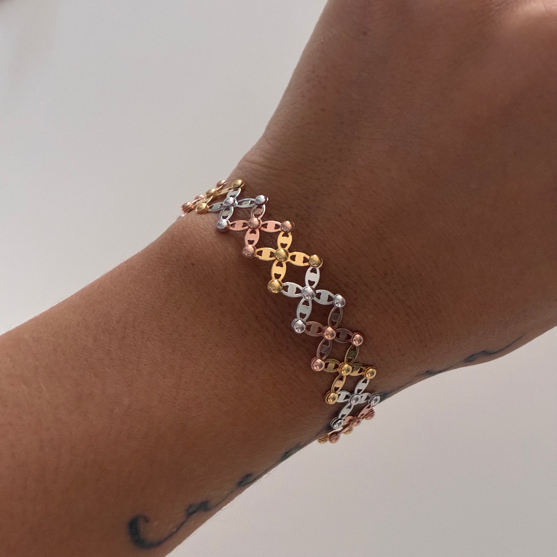 2 IN 1 RING AND BRACELET LADDER WEAVE THREE GOLD 18K ITALY ADJUSTABLE - 9.1GR
