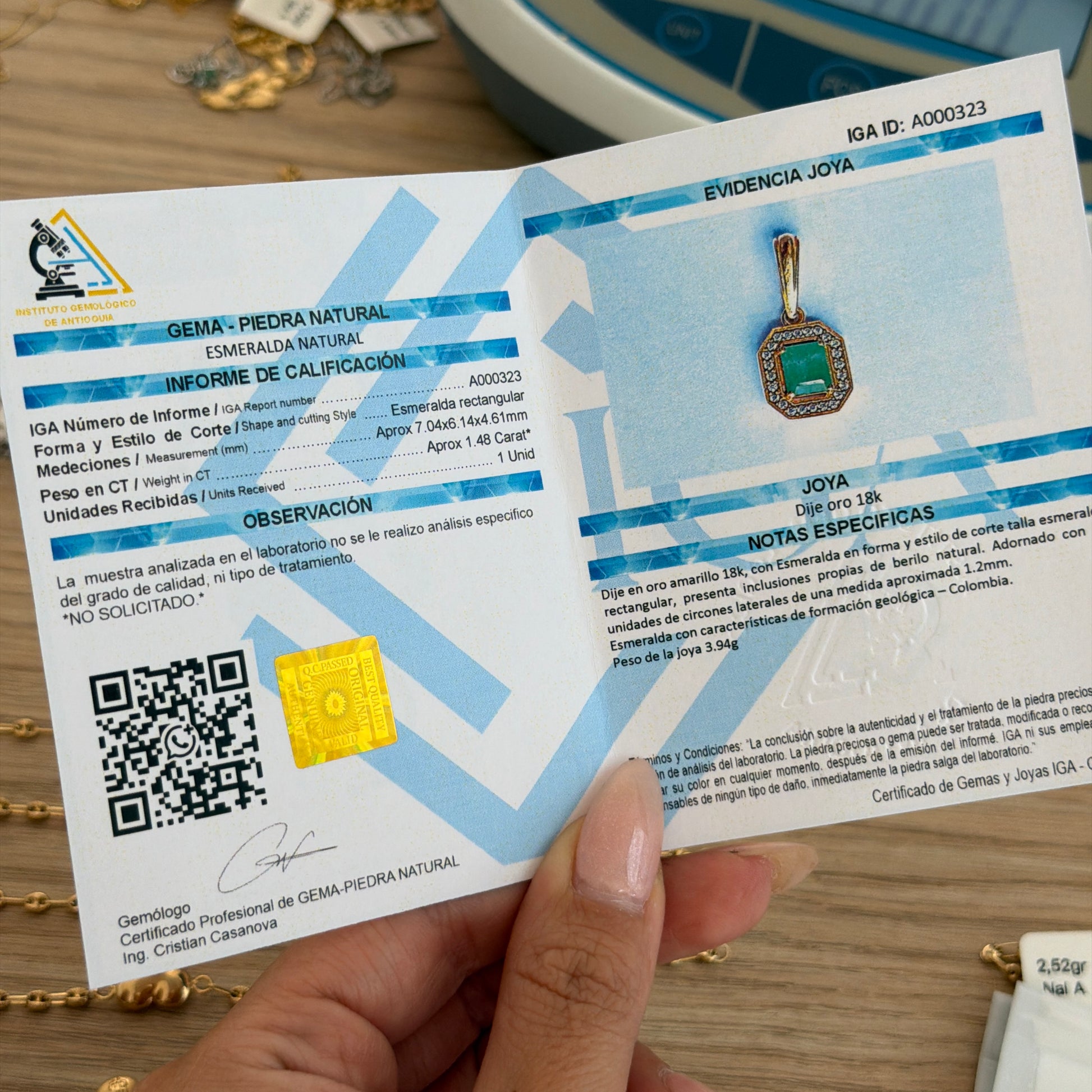 NATURAL EMERALD SQUARE PENDANT + WHITE STONES 18K YELLOW GOLD NECKLACE - 3.94GR