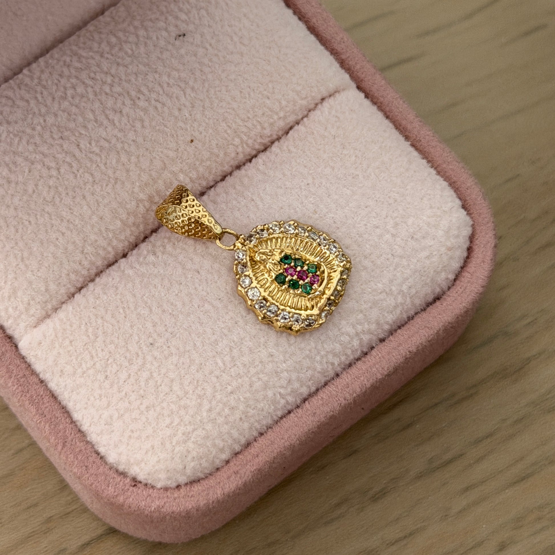 VIRGIN OF GUADALUPE SILHOUETTE PENDANT WITH WHITE AND GREEN STONES IN 18K YELLOW GOLD - 1.55GR