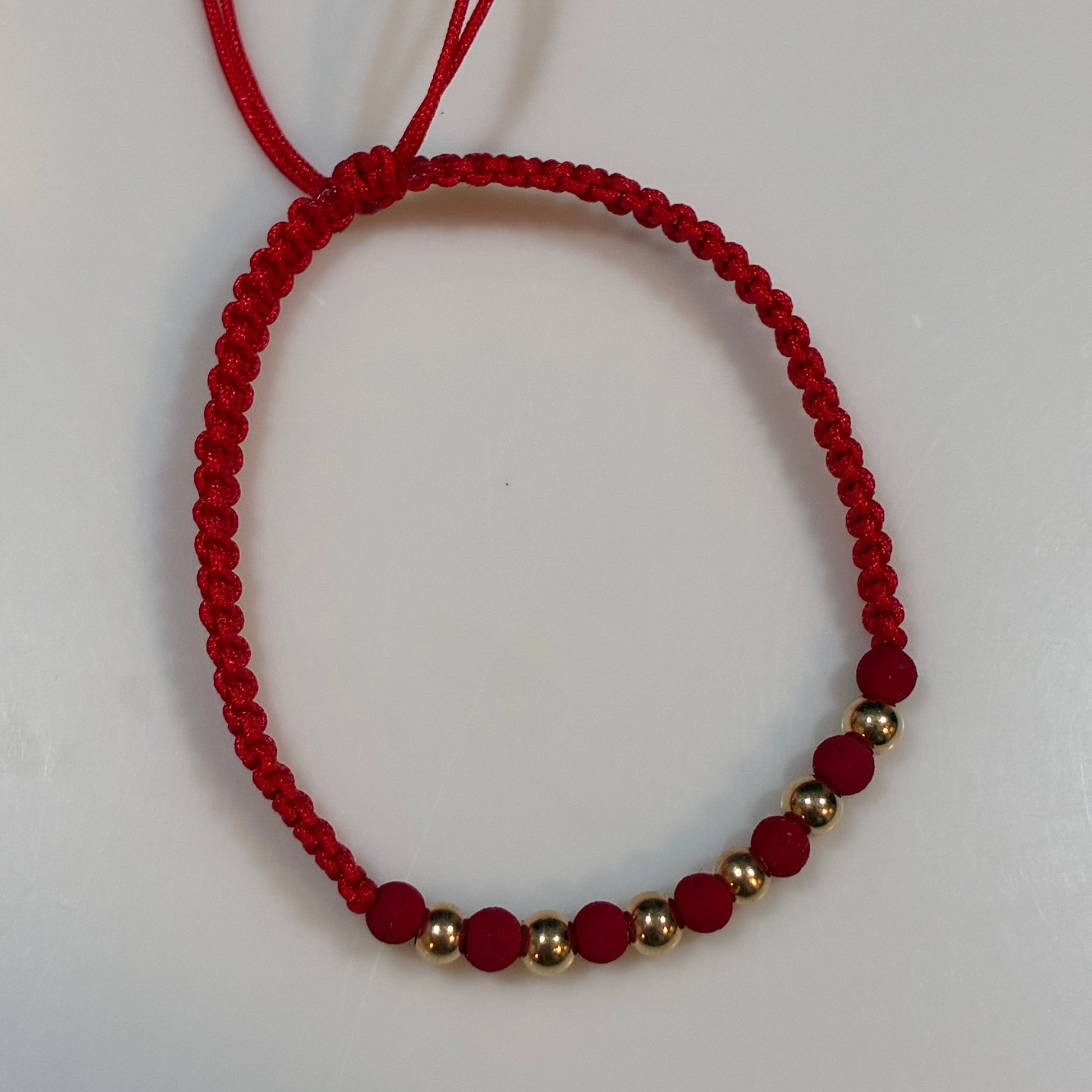 RED THREAD BRACELET WITH 6 SMOOTH 4MM BEADS IN 18K YELLOW GOLD - 0.54GR